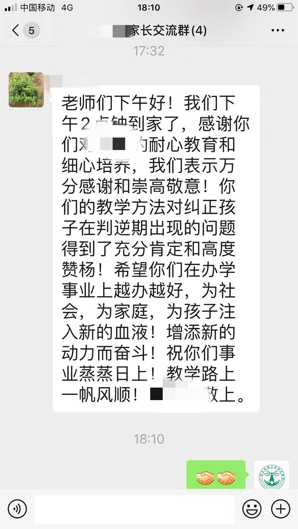 小阳到家之后,小阳的爸爸给基地郑老师发来了反馈,看到这样的肯定,老师和教官们很受鼓舞,更坚定了做好叛逆少年教育事业的决心,大家互相勉励,为“少年强而国强”的愿景继续努力!!