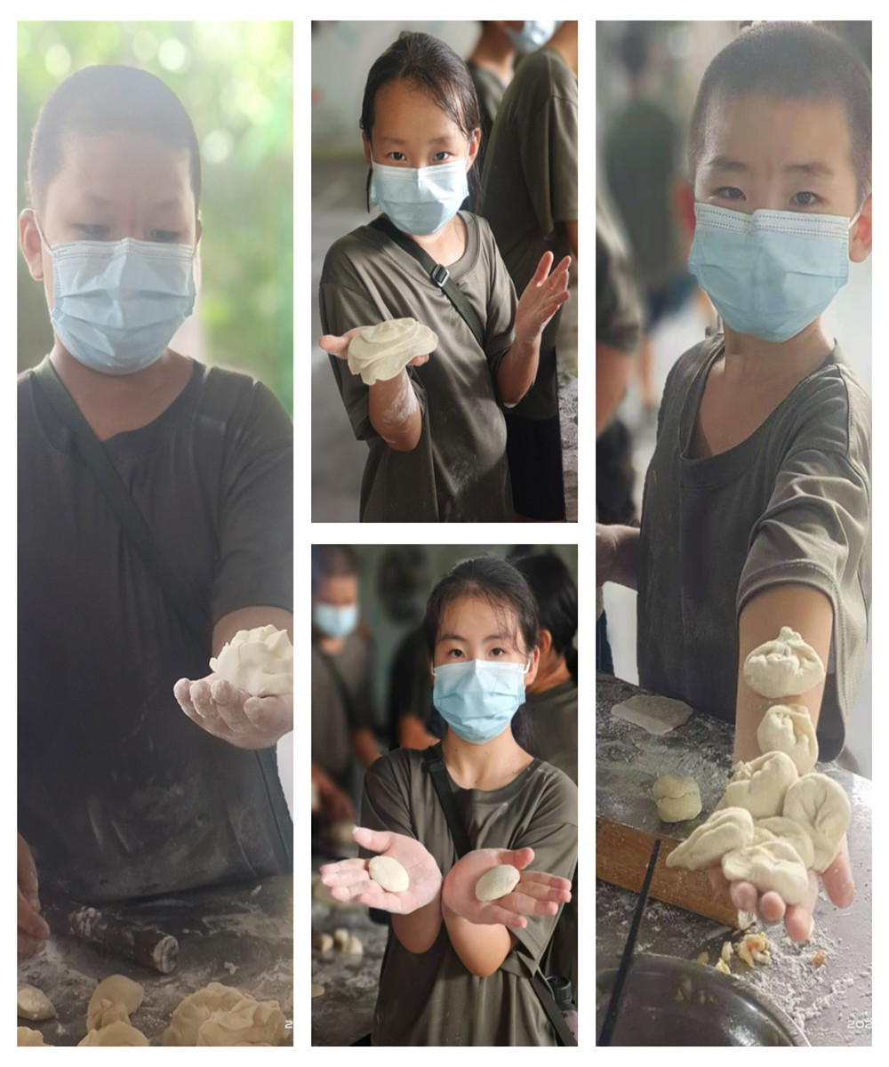 场面也更加热络起来了,孩子们像是一群小麻雀一样围在案板旁,头碰着头,肩挨着肩,叽叽喳喳的讲着话,做着各式的面皮包着各式的饺子。时而展示着自己的作品给老师教官看,得到肯定之后就很开心。