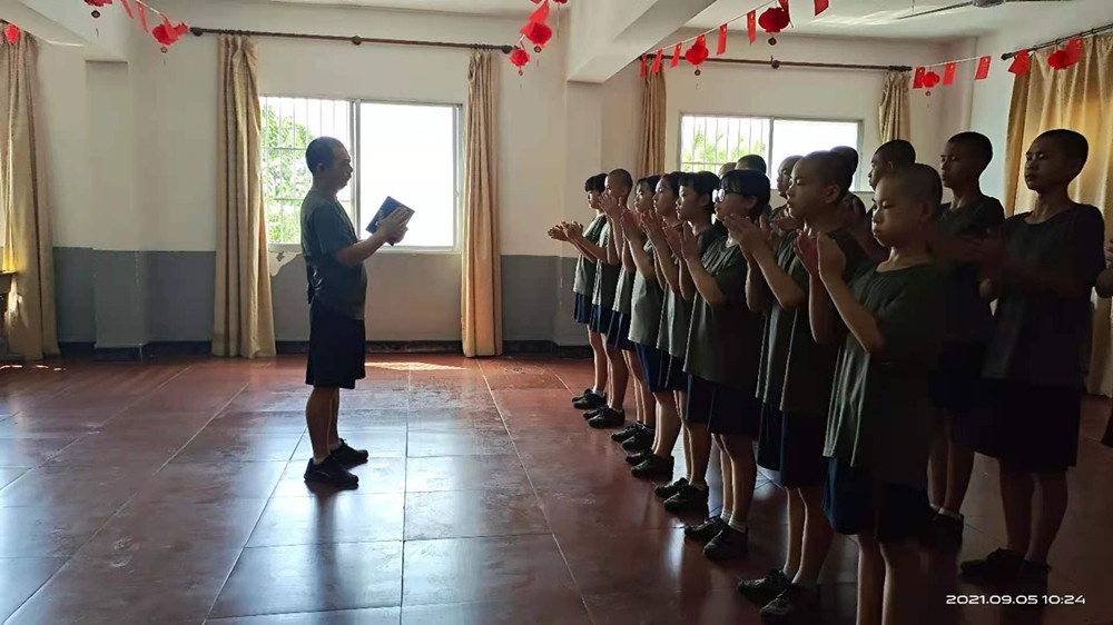 9月5日,初秋的阳光斑驳的映照在基地孩子们身上,小柏队长带领着组员们进行日常的军事训练,思路清晰,口令响亮,动作利落,自信大方。