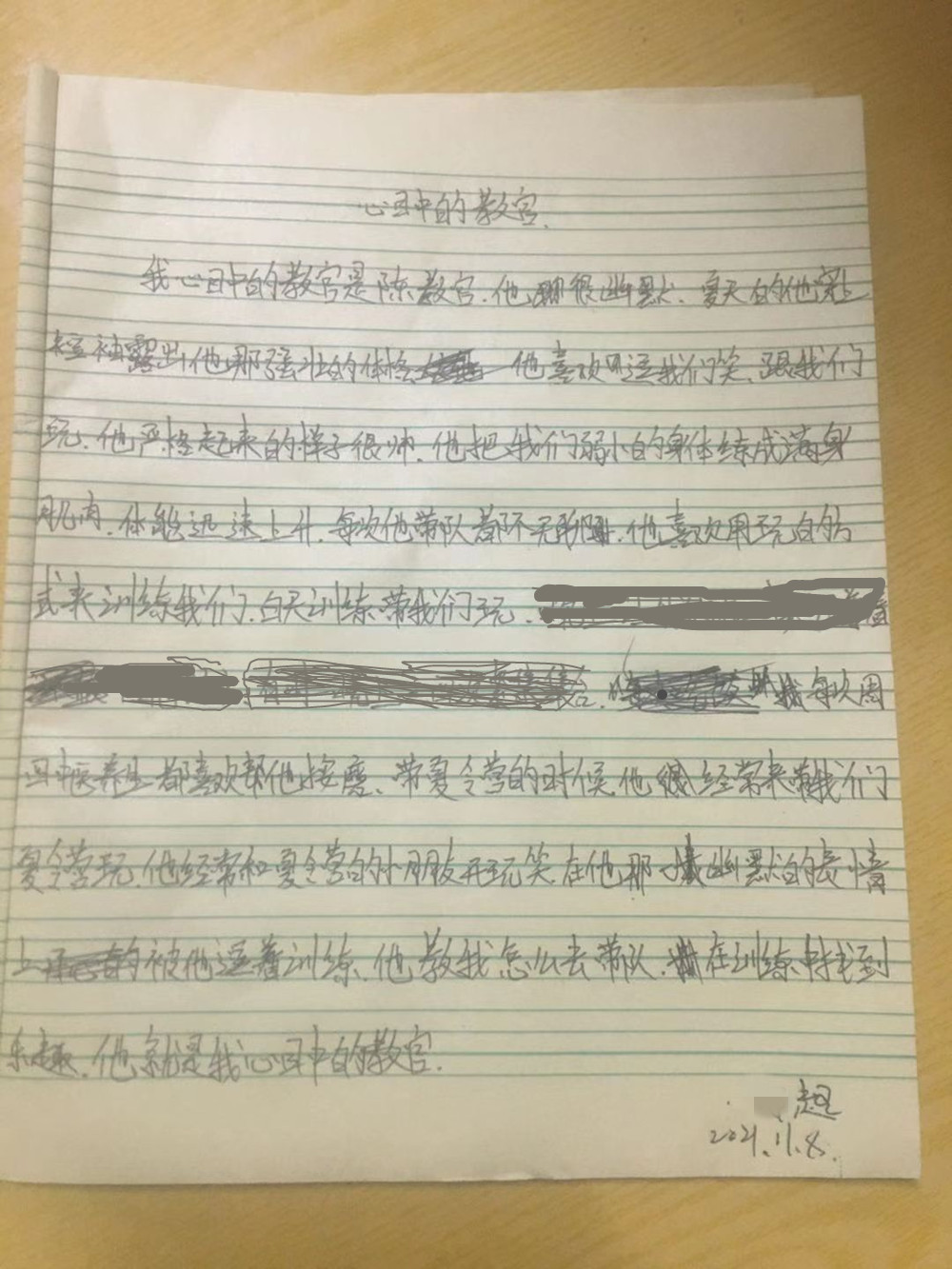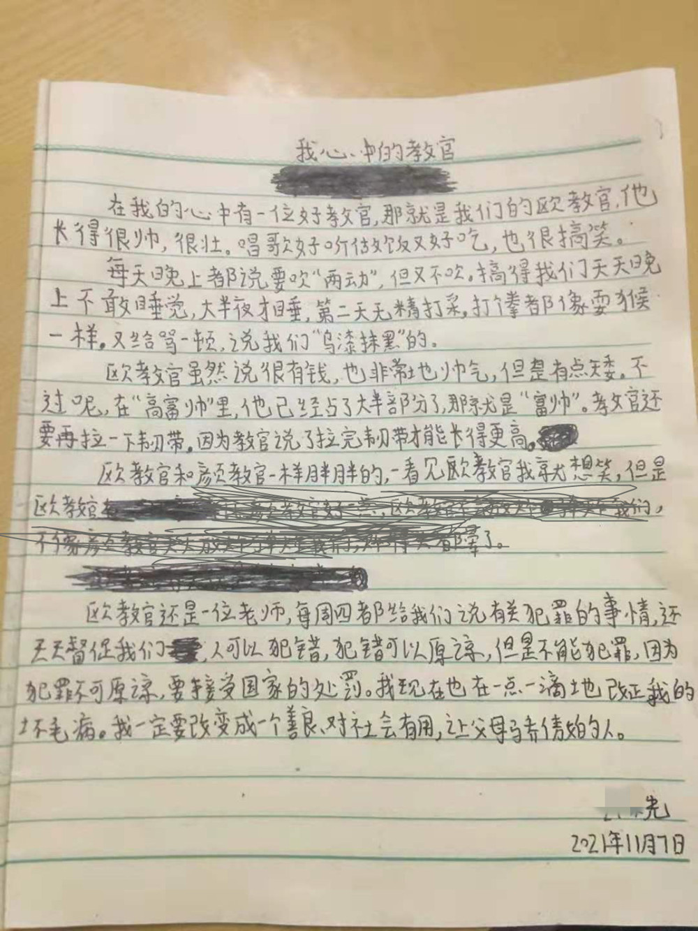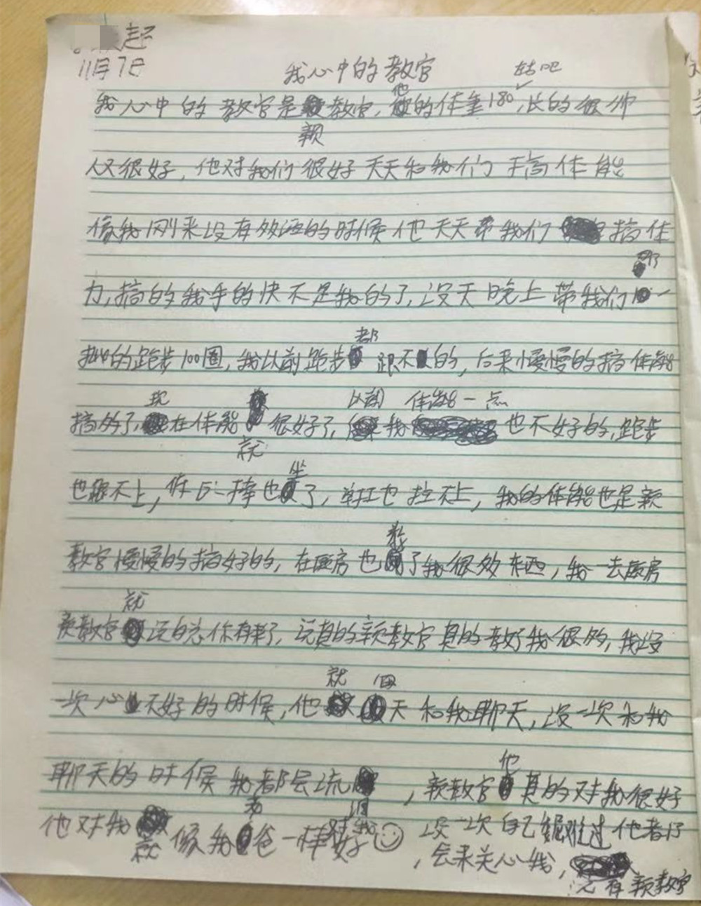 写这段文字的孩子是小先,平日里他只要一写字就头大,挠头搔耳才憋出一两个字,但是他写起教官来却生动有趣文思泉涌,因为他喜欢这位教官。