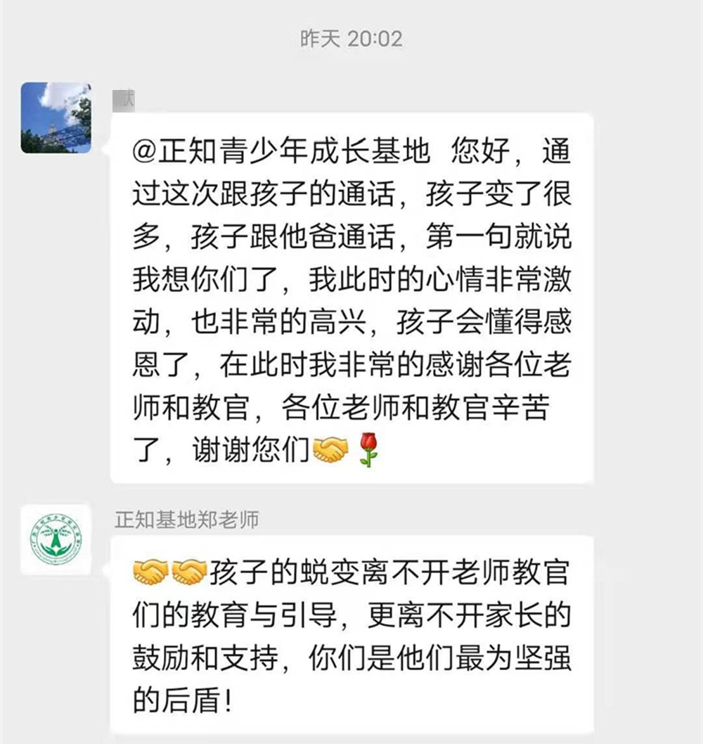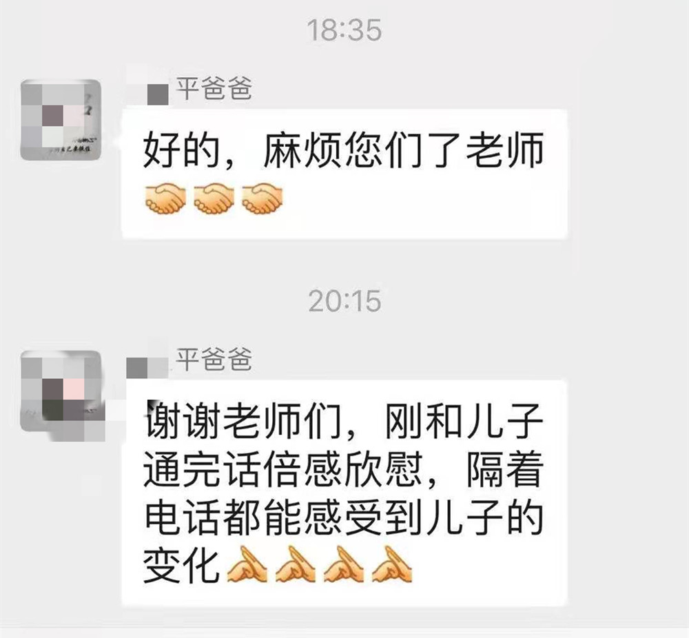 在与父母的通话中,孩子可以做到心平气和的与父母交流了,在了解了父母送他来基地的良苦用心之后,小吕气愤、怨恨、委屈、不满的情绪在通话中得到了释怀,小吕有了对未来的思考,父母则鼓励他朝着目标坚持努力。这一次通话后,小吕家长很是欣慰,发来反馈给基地:“谢谢老师们!刚和儿子通完电话倍感欣慰,隔着电话都能感受到儿子的变化。”