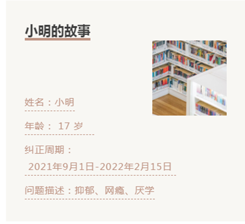 小明来到正知基地的时候,头发蓬乱,脸色苍白,眼神呆滞、神情悲苦、瘦骨嶙峋。