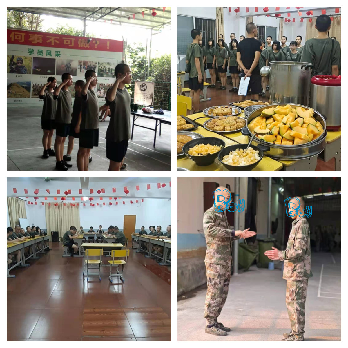 他开始调皮了。小组训练中,谁的动作不标准,就要被队长罚“弹脑门”,轮到小明去弹脑门的时候,他出其不意的把同学脑门上的青春痘给挤掉了,惹的同学们哄堂大笑,他也娇羞的笑了。
