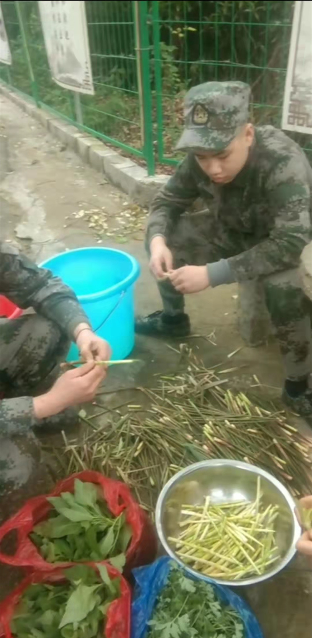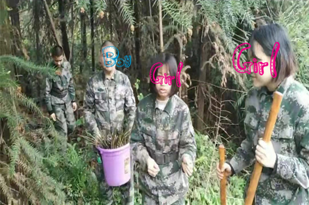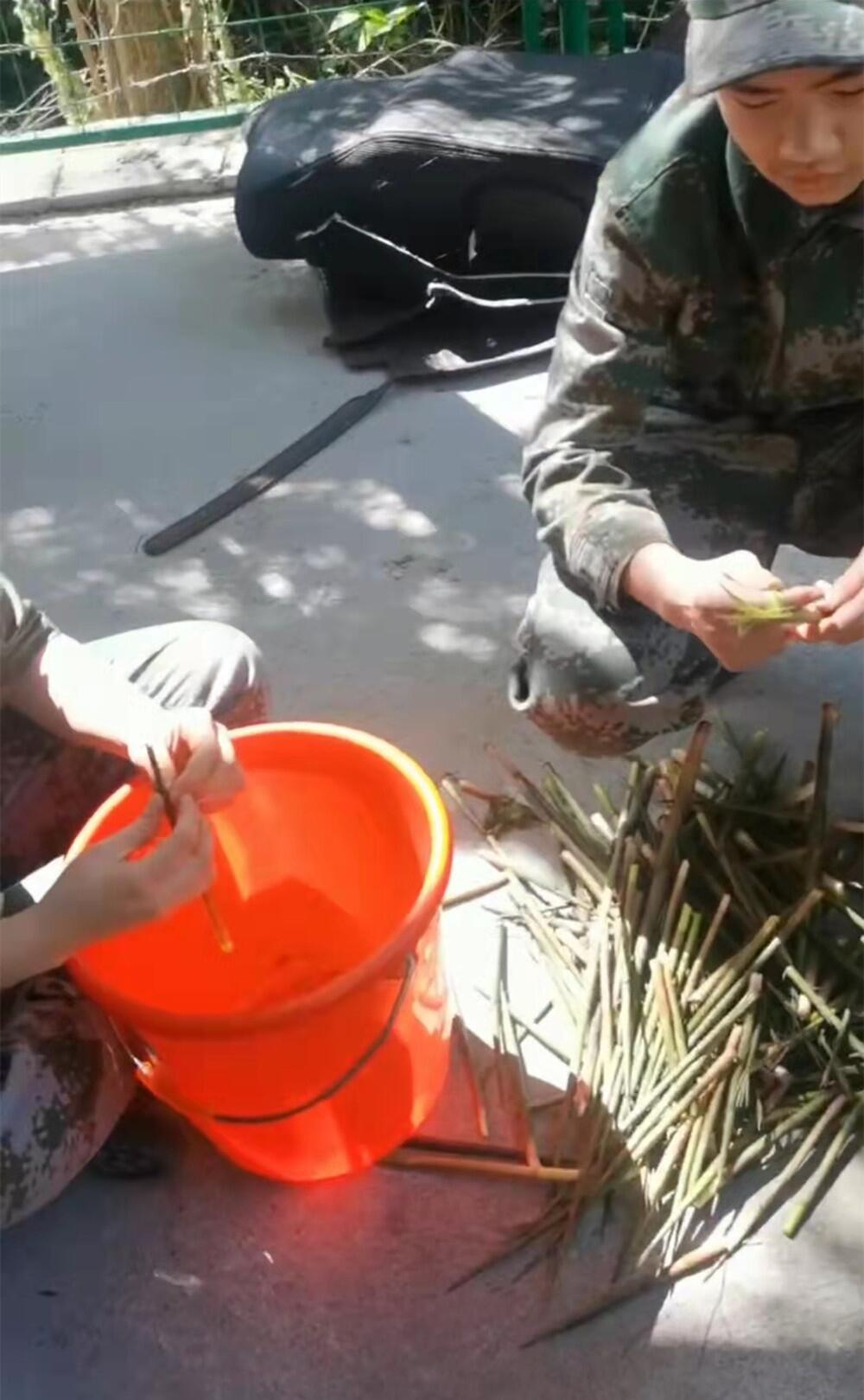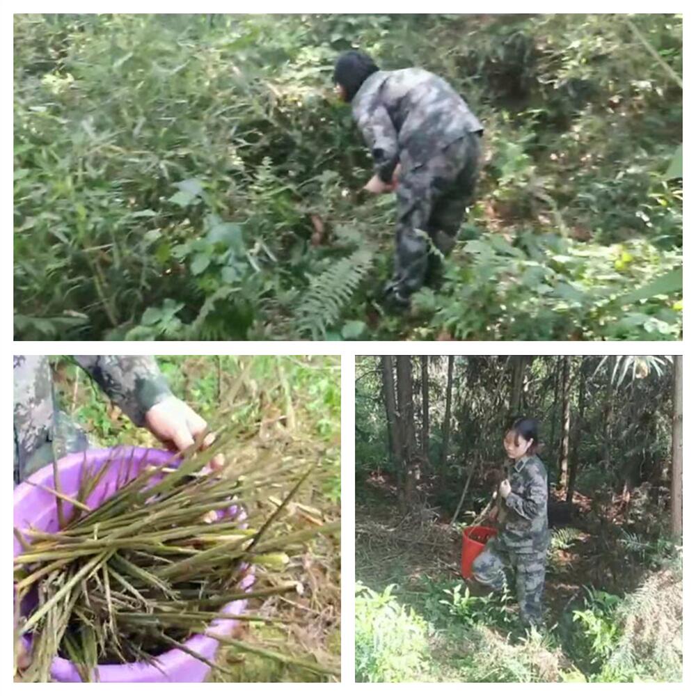 孩子们身着迷彩服,挎着桶和盆子,跟着教官钻入了小树林。小树林里林木葱茏,竹林和其他林木混杂在一起,密密匝匝的长得很是旺盛,鲜嫩的小笋东一根西一根的藏在林子里。这可难不倒眼尖的孩子们,他们很快的就锁定了春笋的位置,找到根部,一折一掰,笋子就到手了。很快,孩子们就收获了满满的一大桶春笋。
