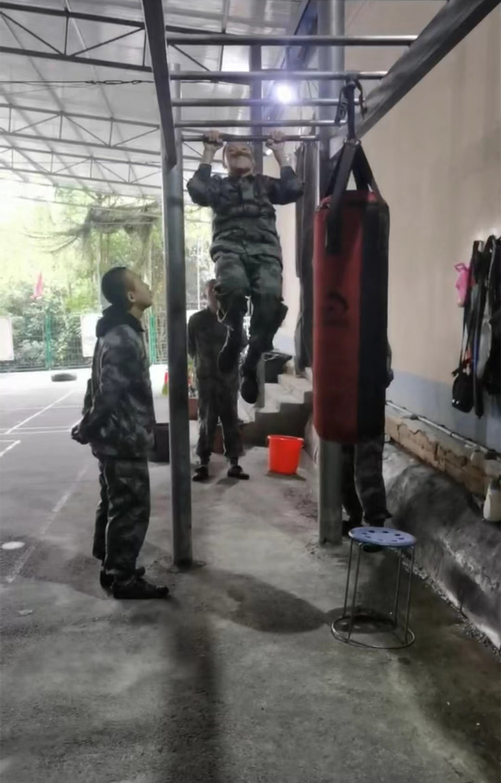 15:39分,军事体能考核开始。下午的考核内容为:引体向上,深蹲、仰卧起坐、俯卧撑、跳绳、蛙跳、3公里,5公里跑等。引体向上为必考项目之一,也是难度较大的一个项目。