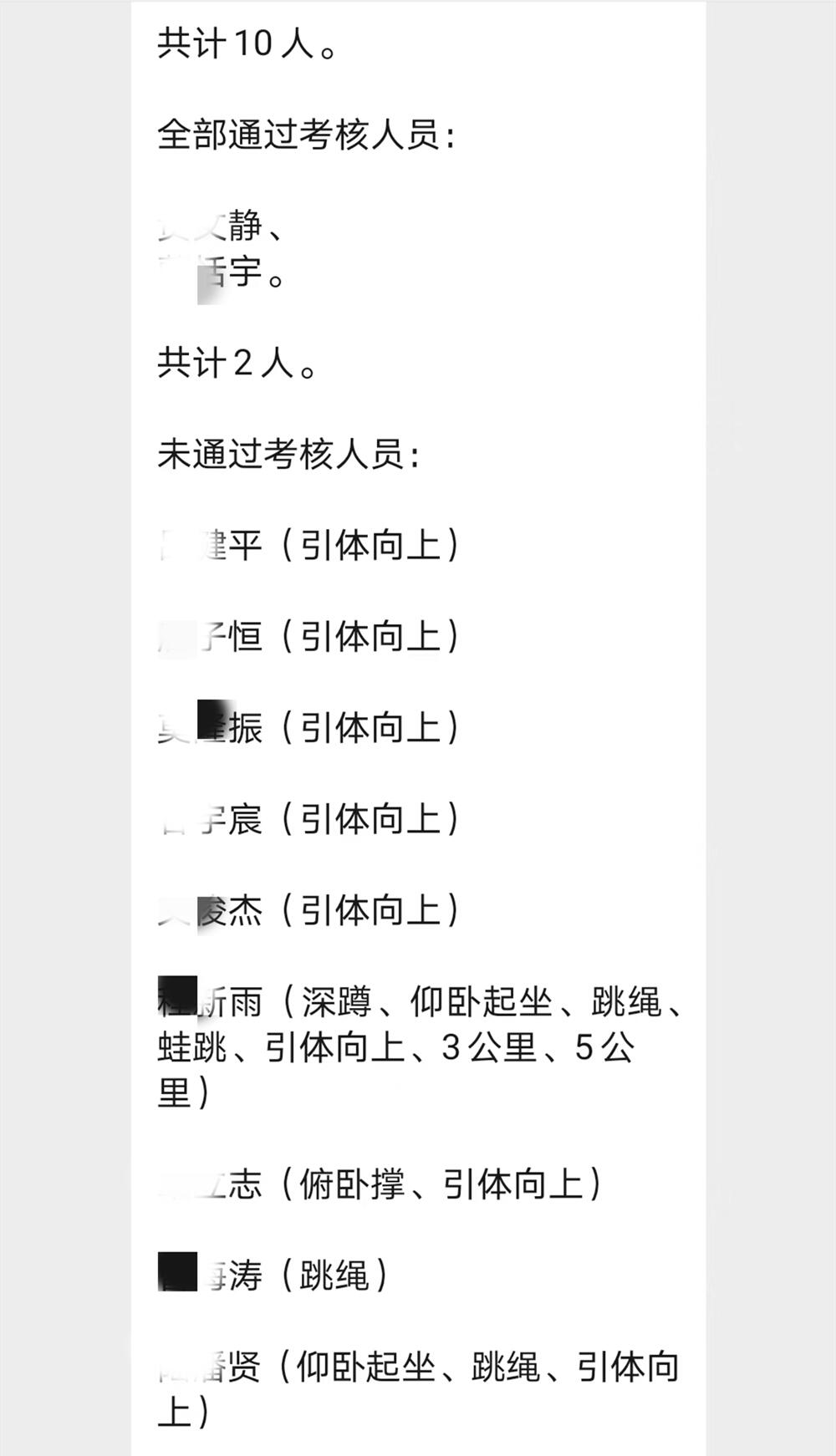 17:00 今日的军事体能考核结果公布:军事一参考人员共计5人,通过4人,一人未通过。军事二(体能)考核参考人员共计10人,通过2人,大部分没有通过的人员都是因为引体向上没有过关。
