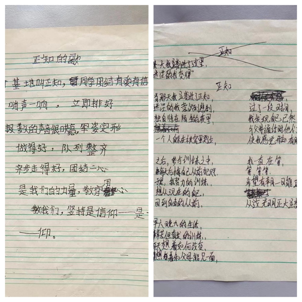 在教官老师的带领下,孩子们把手稿集中在一起,进行筛选组合,要考虑歌词的句式,整齐感,还有韵脚、段落,孩子们不禁感叹,原来写歌词也很不容易呀,从两三千字中,编写出十六句词。几个文化功底较好的孩子担任了此次的主力军,并且,在此过程中,对创作产生了浓厚的兴趣。