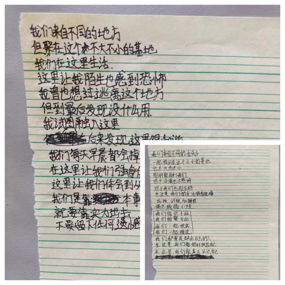 “互相的帮助,成就了非同寻常的友谊,虽然很辛苦,但心里感恩教官老师的教诲……”