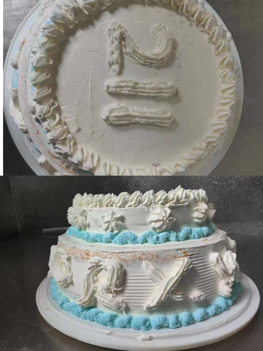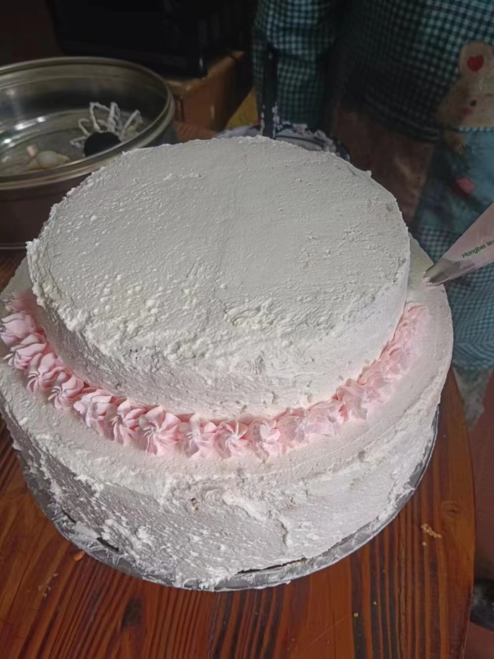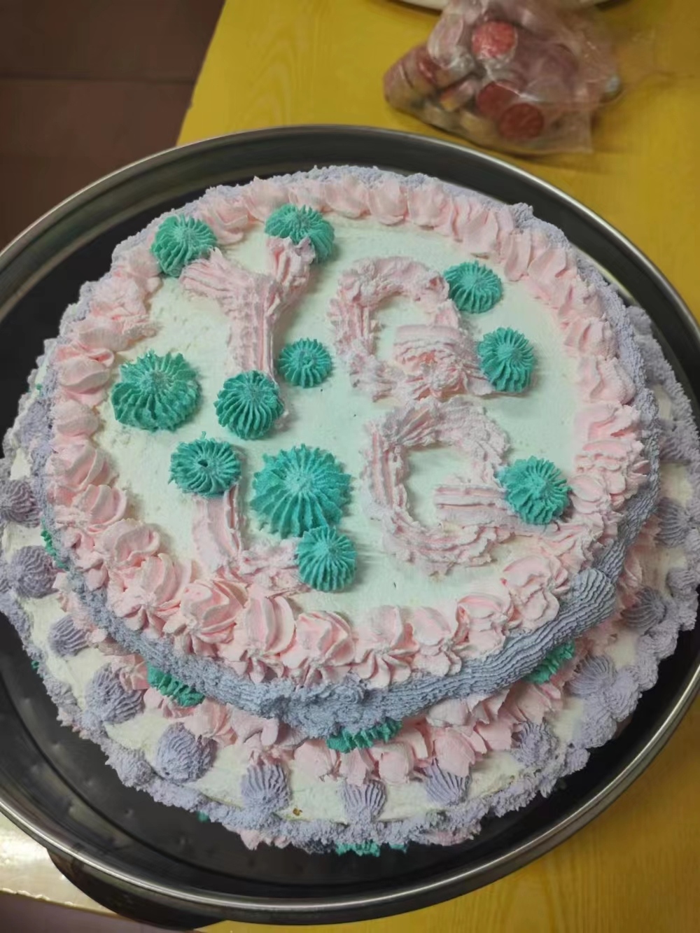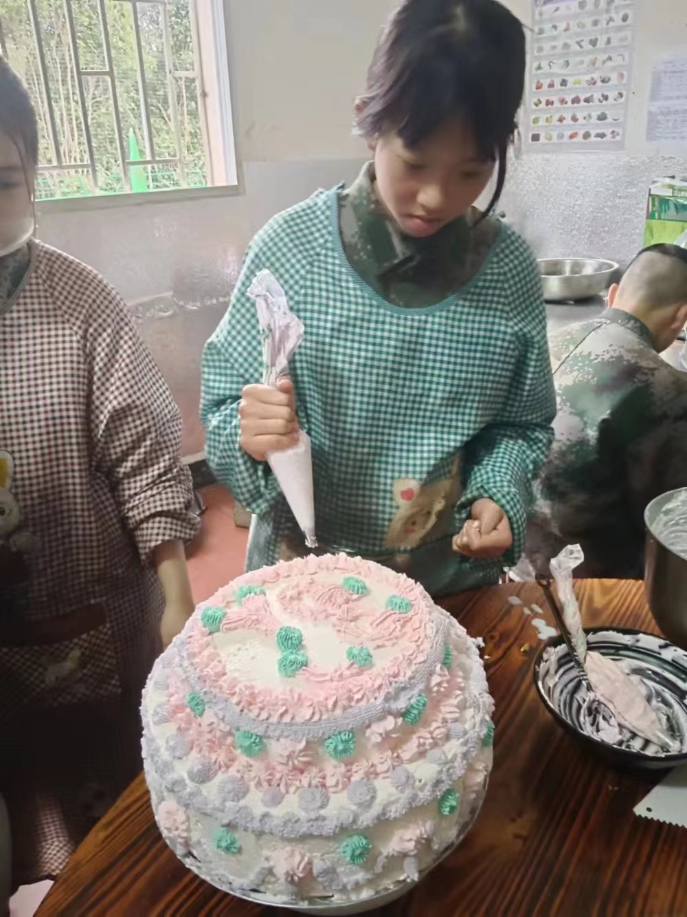 调好奶油后,终于到了装裱的重要环节,小淇、小林决定以春天为主题,用粉色、蓝色、紫色挤出了不同的花色纹理,一眼看去,如同花团锦簇、春花烂漫,在蛋糕上面,她们写下了“Q、Q、Y、L”四个英文字母,这是四个女孩名字最后一个字的首字母。