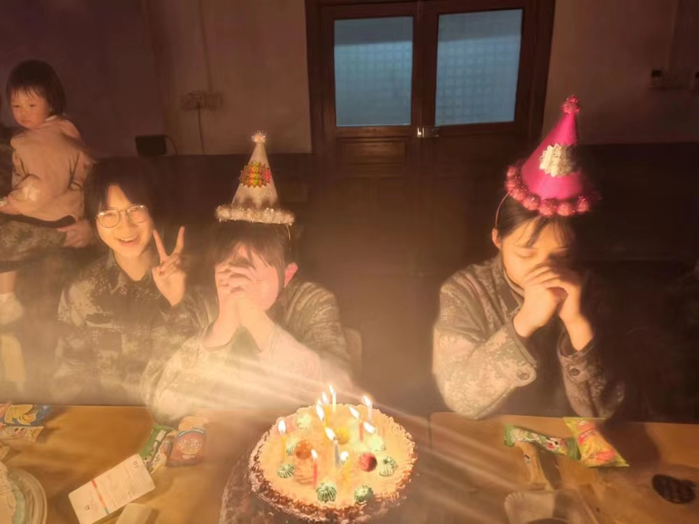 大家在蛋糕上插上蜡烛,还贴心地给四位小寿星戴上了生日帽,关上灯,孩子们拍着手齐声唱起了《生日快乐歌》,在同伴们美好的祝福中,在烛光摇曳中,四个女孩微笑着闭眼许下自己的愿望,然后一起吹灭了蜡烛。小淇看着蛋糕,突然间哭了。