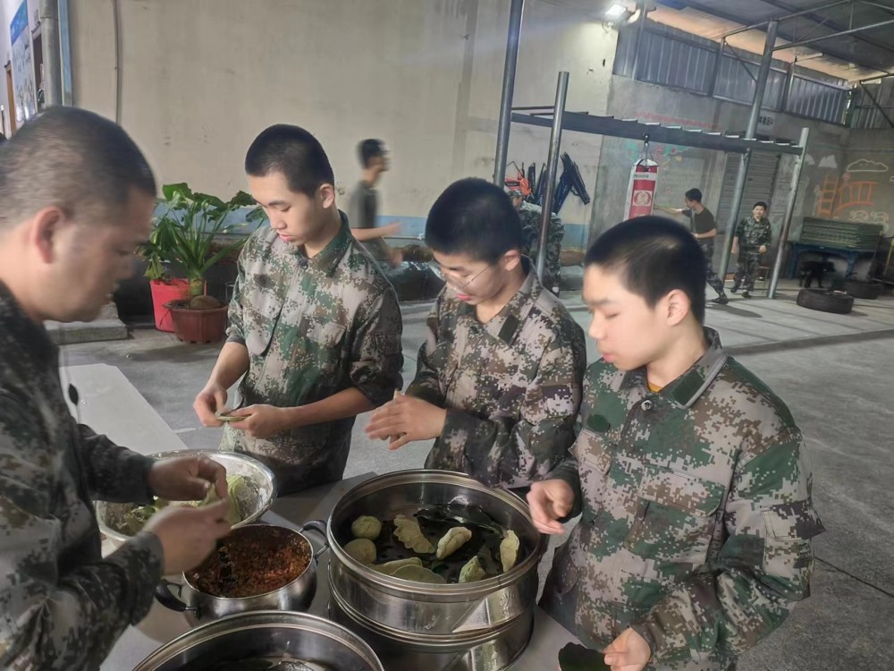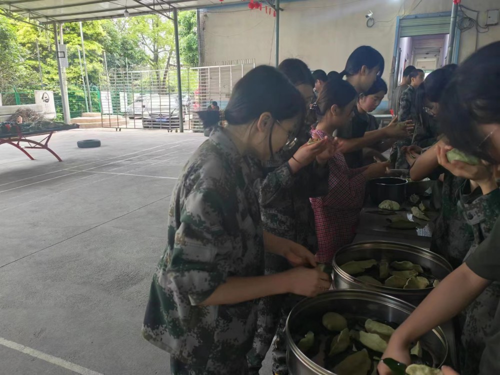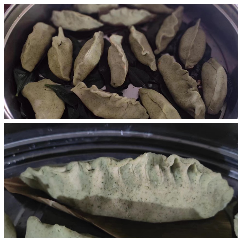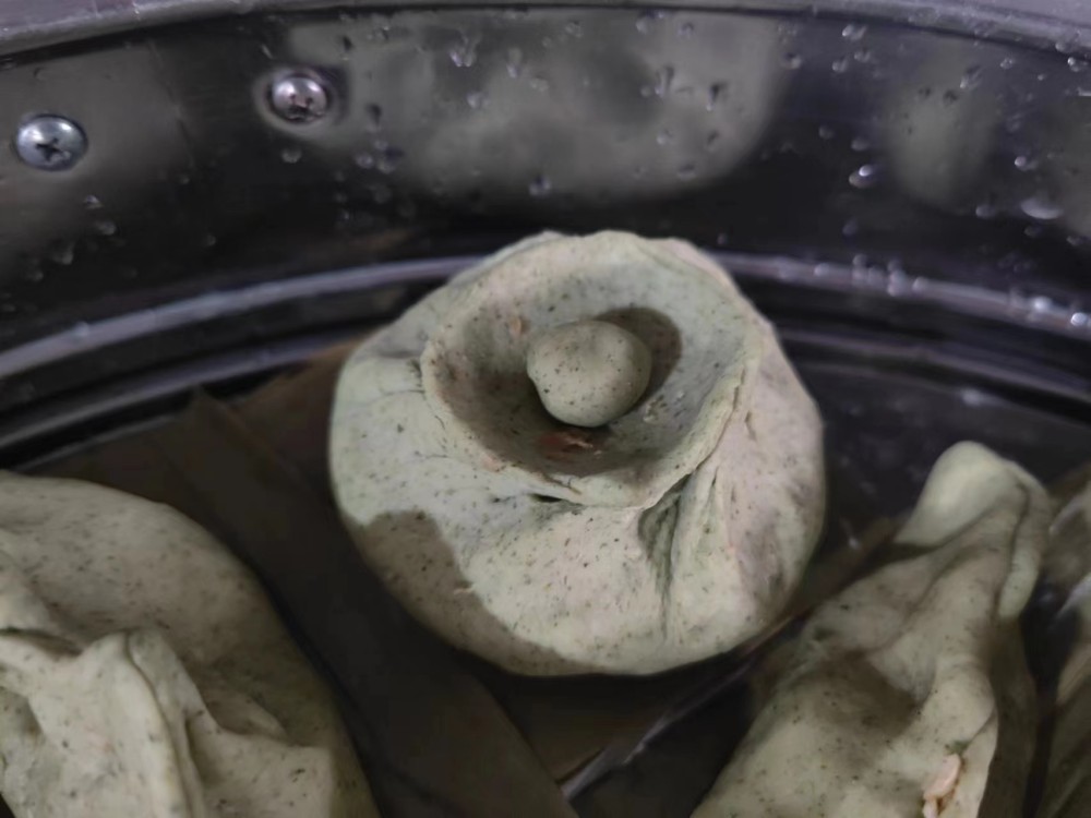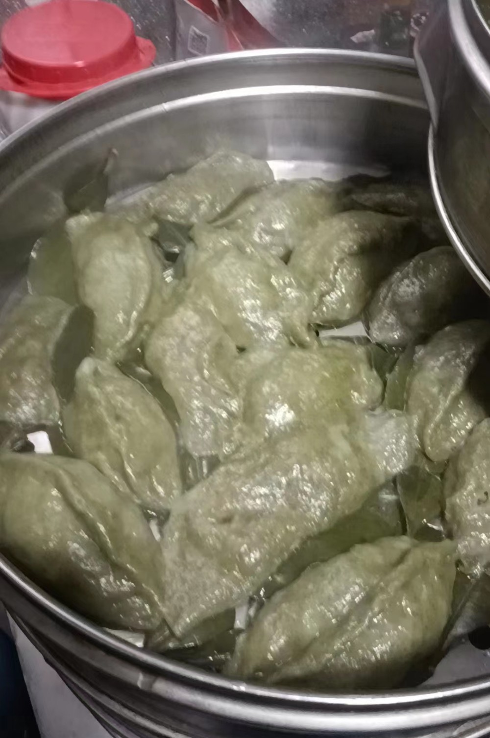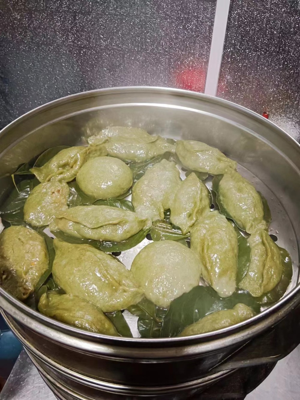 好不容易,青团终于蒸熟了,打开盖子的时候,大家忍不住笑了,由于摆得靠近,有一锅青团们几乎成了“一家人”,欧教官打趣说:“看来,青团们的感情像你们一样好啊,相亲相爱的,哈哈。”大家笑得更开怀了。