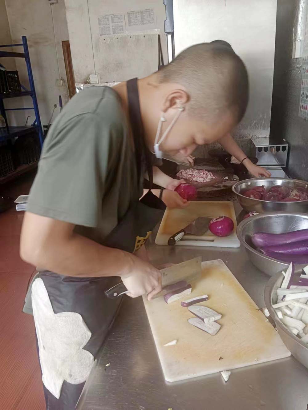 厨房里,他动作麻利,快速收拾食材,耐心教同学炒菜要诀,控制火候。
